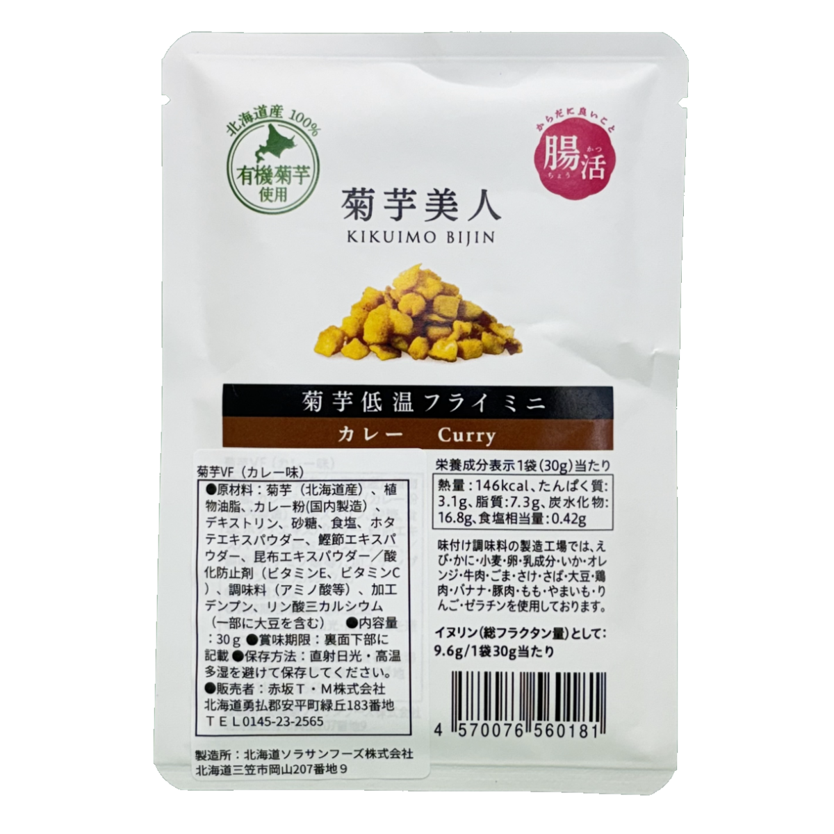 原材料名:菊芋(北海道産)、植物油脂、カレー粉、デキストリン、砂糖、食塩、ホタテエキスパウダー、鰹節エキスパウダー、昆布エキスパウダー/酸化防止剤(ビタミンE、ビタミンC)、調味料(アミノ酸等)、加工デンプン、リン酸三カルシウム、(一部に大豆を含む)